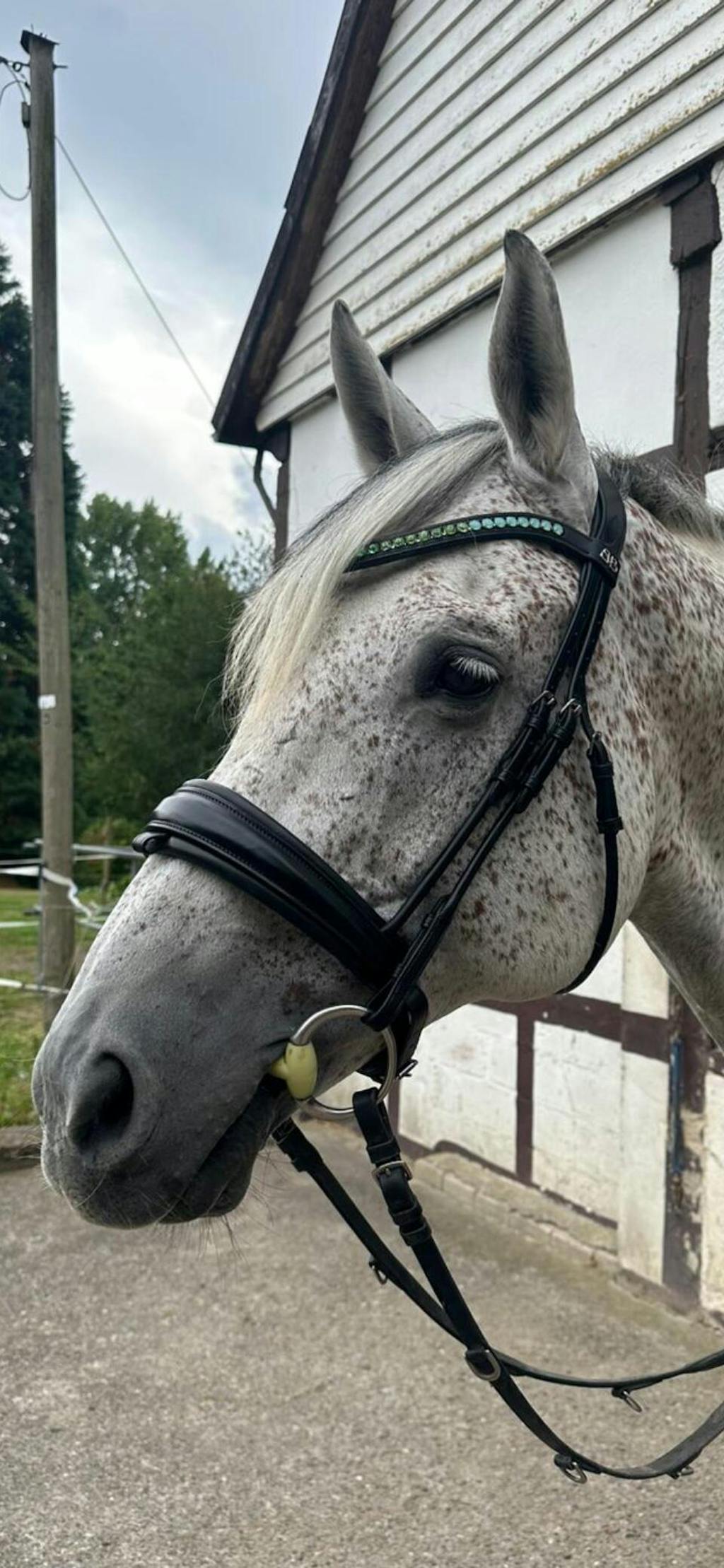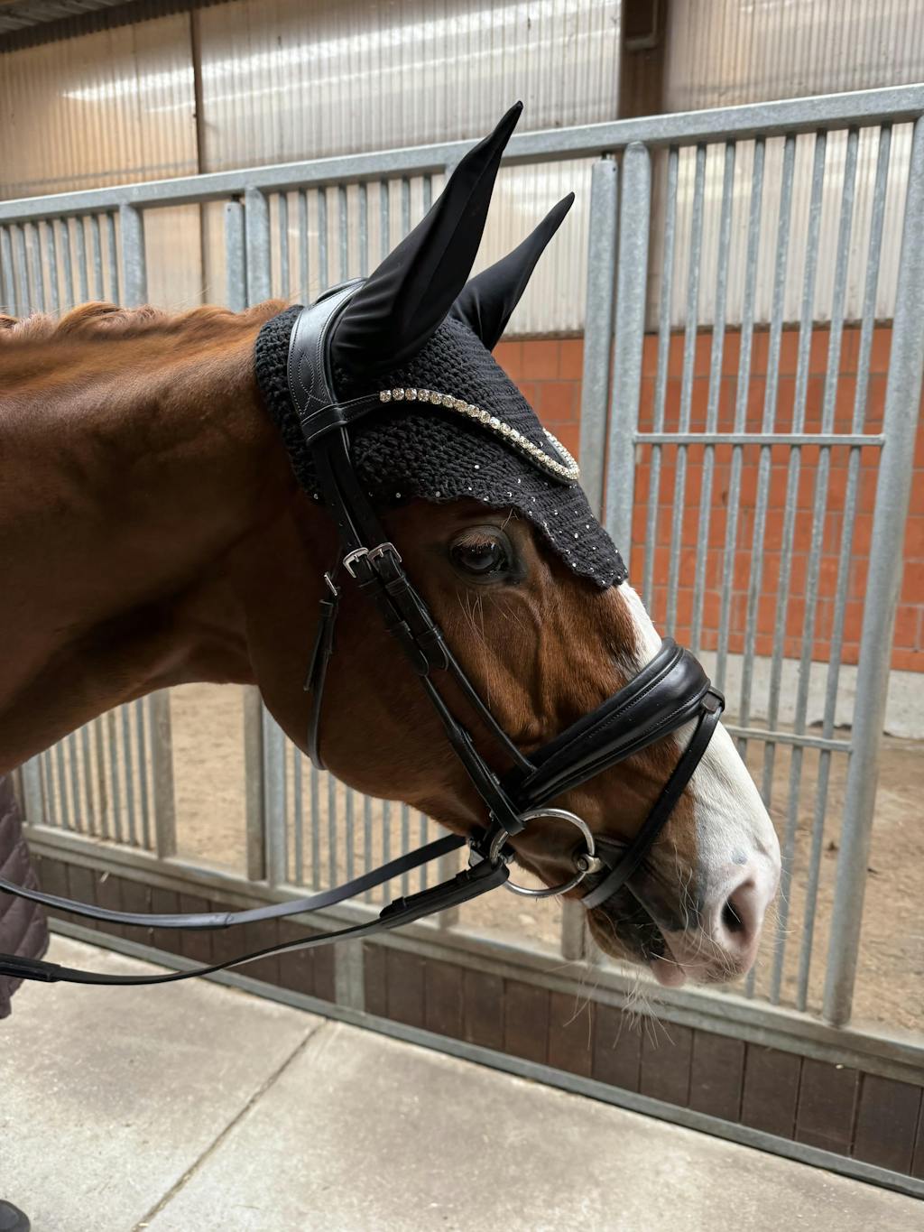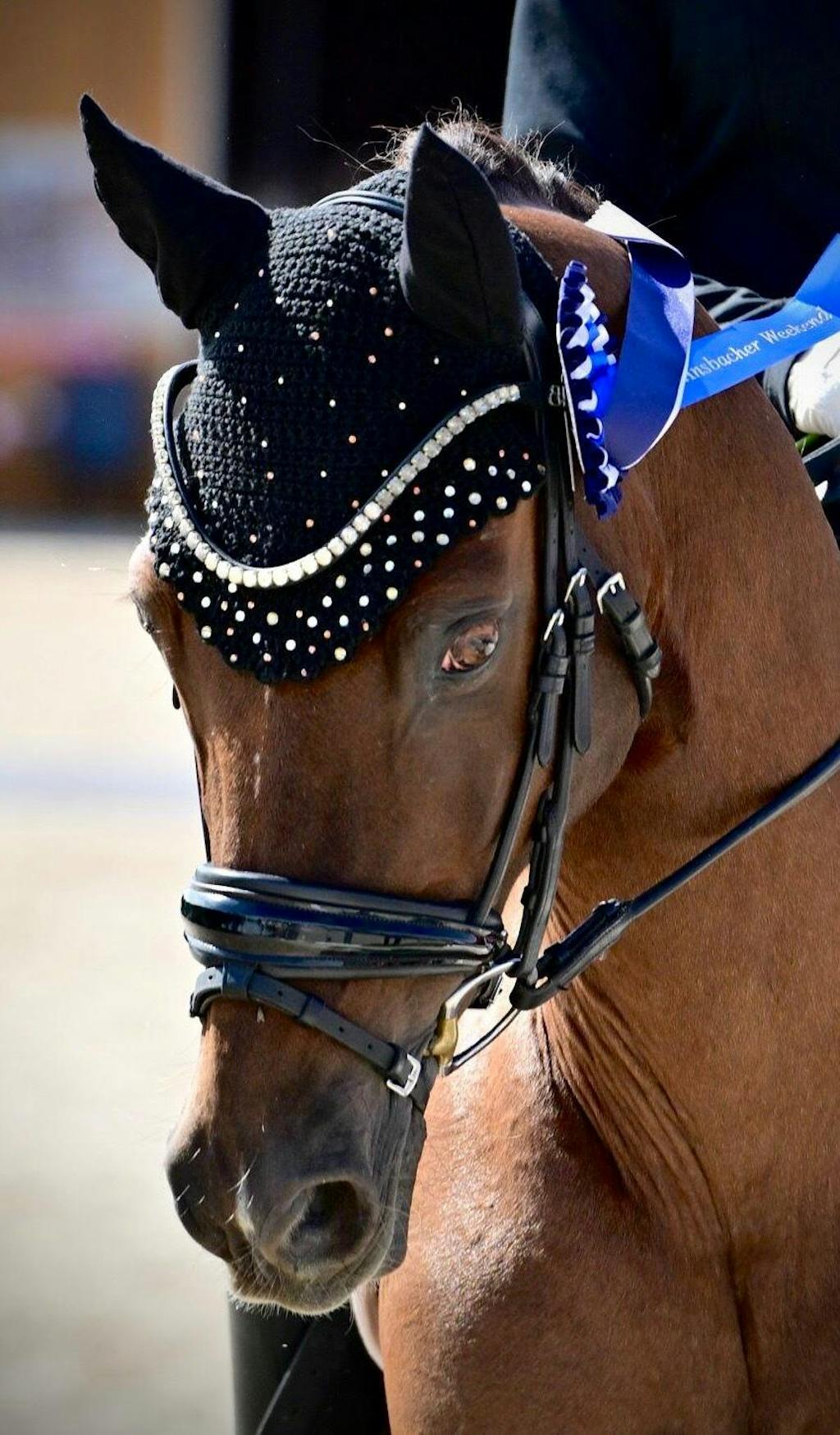 Unser funkelnder Stirnriemen ist das Herzstück deines Zaumzeugs. Bitte achte darauf, dass sich dein Pferd damit nicht scheuert oder wälzt. Kontrolliere regelmäßig die Kristallfassungen – gelockerte Häkchen kannst du vorsichtig andrücken (z. B. mit einer Pinzettenrückseite).