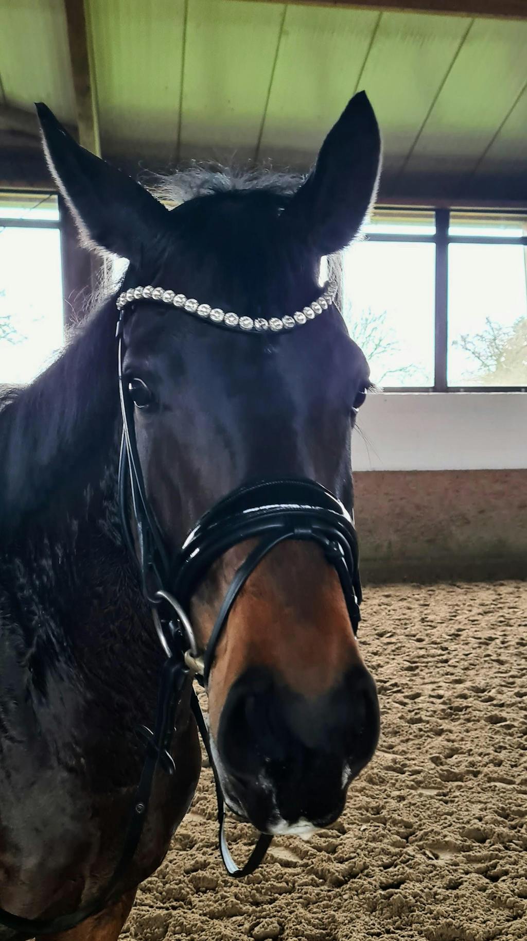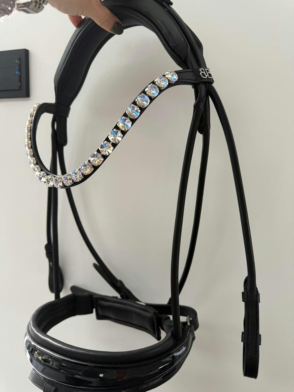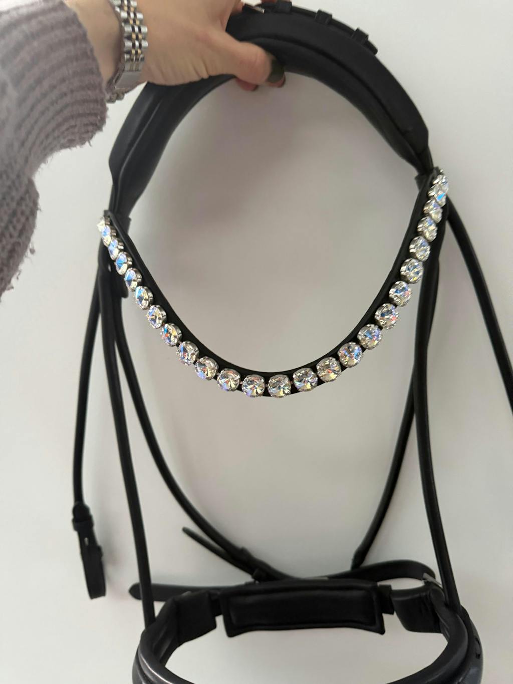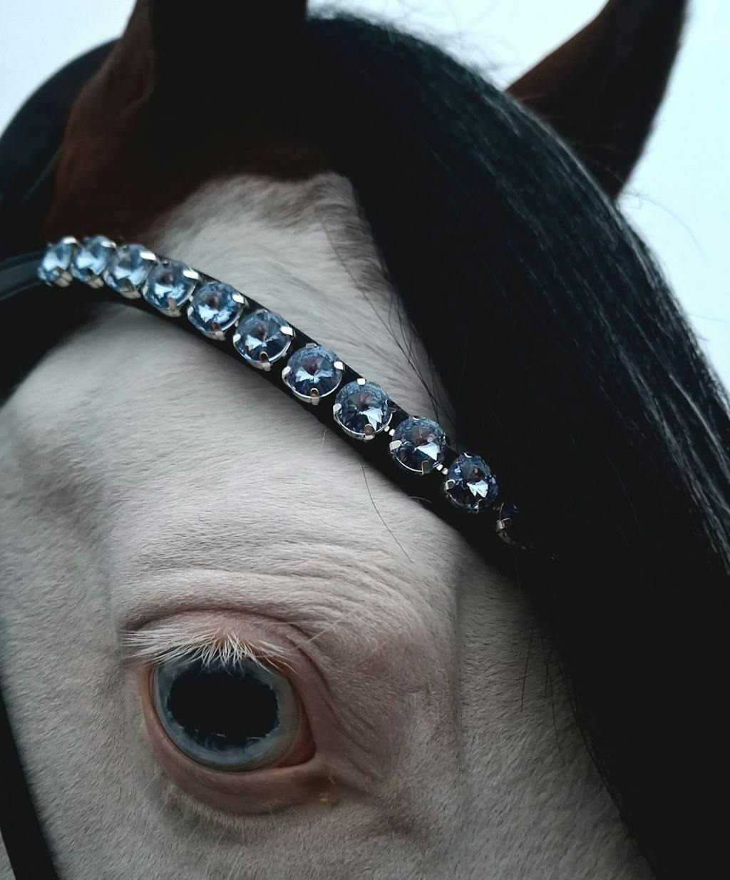 Unser funkelnder Stirnriemen ist das Herzstück deines Zaumzeugs. Bitte achte darauf, dass sich dein Pferd damit nicht scheuert oder wälzt. Kontrolliere regelmäßig die Kristallfassungen – gelockerte Häkchen kannst du vorsichtig andrücken (z. B. mit einer Pinzettenrückseite).
