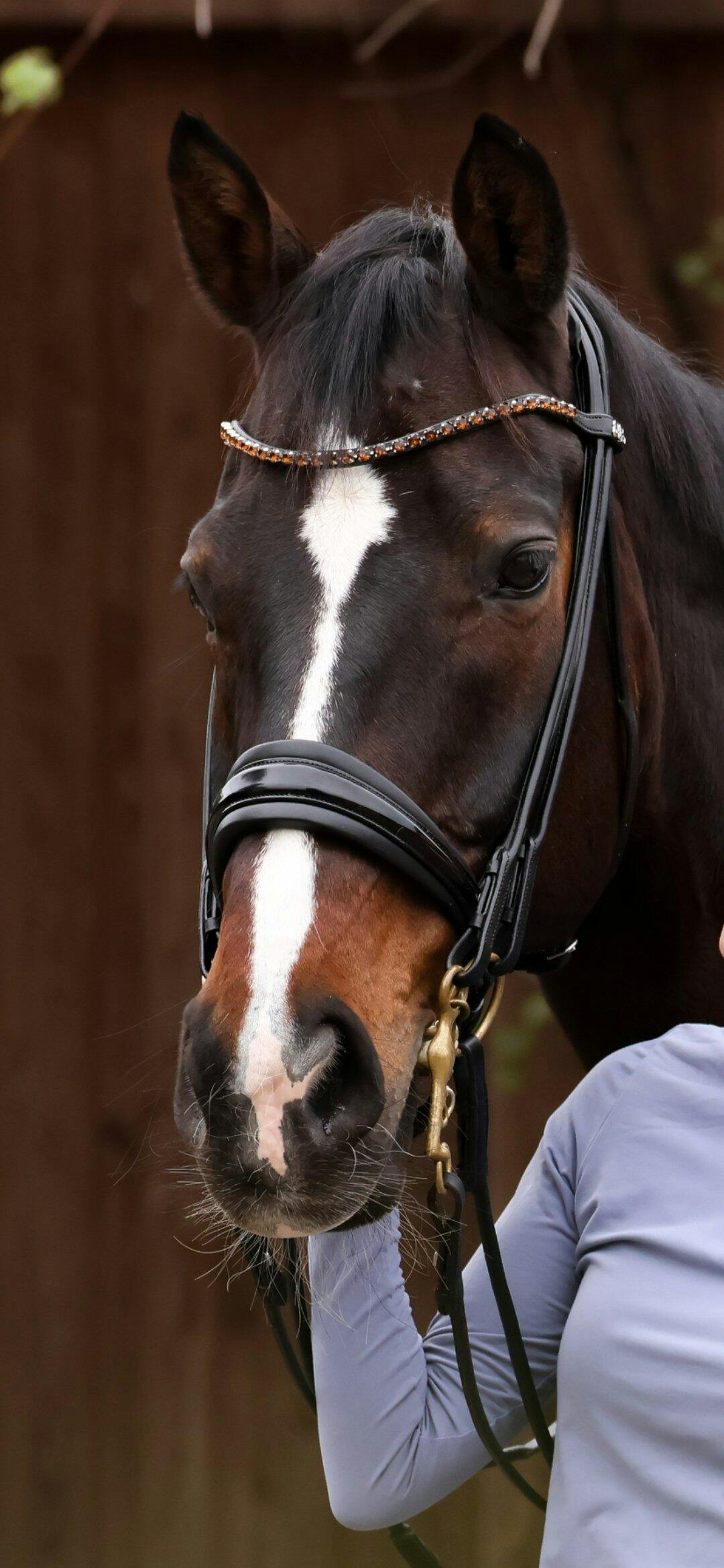 Unser funkelnder Stirnriemen ist das Herzstück deines Zaumzeugs. Bitte achte darauf, dass sich dein Pferd damit nicht scheuert oder wälzt. Kontrolliere regelmäßig die Kristallfassungen – gelockerte Häkchen kannst du vorsichtig andrücken (z. B. mit einer Pinzettenrückseite).