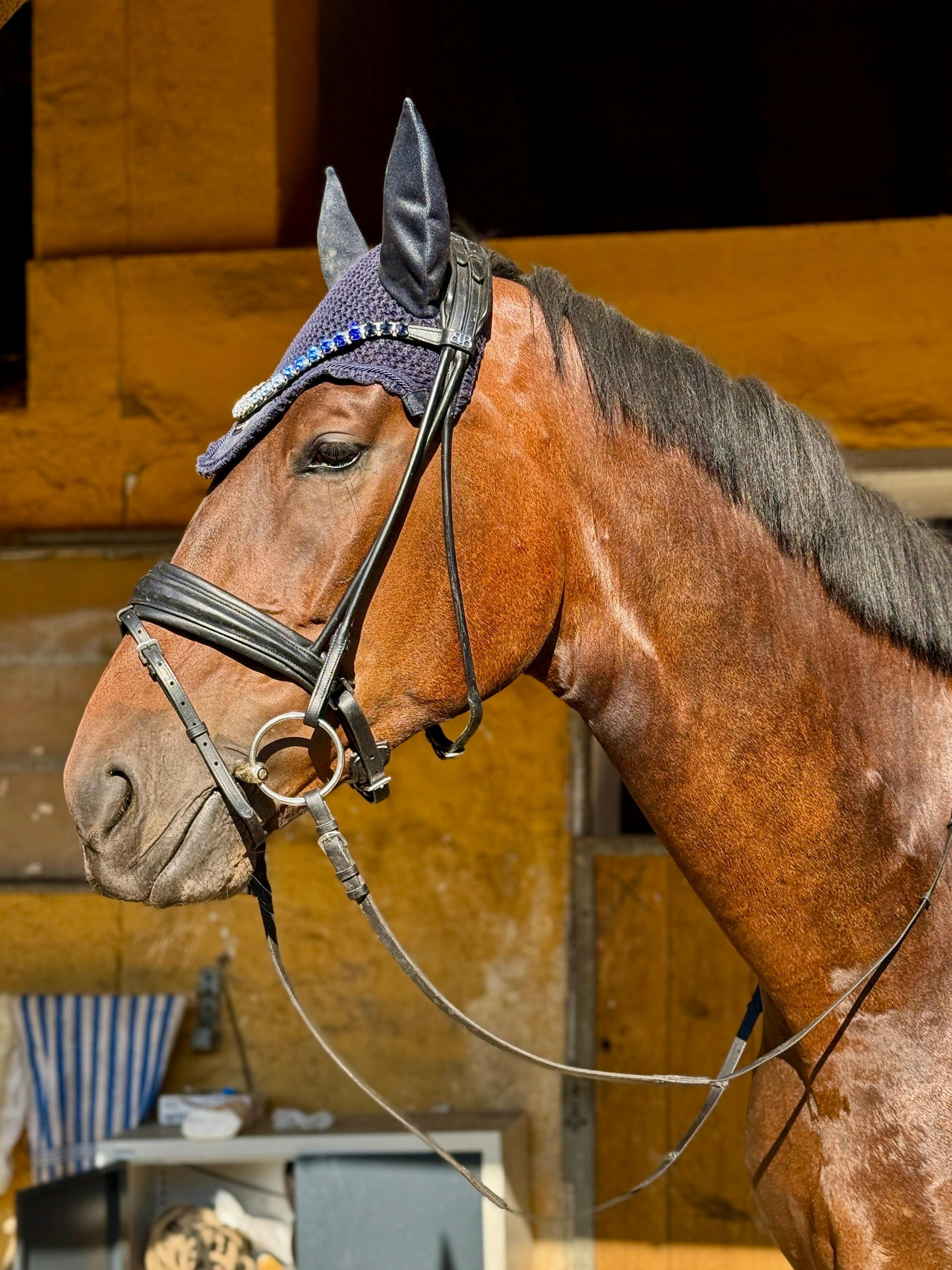 Unser funkelnder Stirnriemen ist das Herzstück deines Zaumzeugs. Bitte achte darauf, dass sich dein Pferd damit nicht scheuert oder wälzt. Kontrolliere regelmäßig die Kristallfassungen – gelockerte Häkchen kannst du vorsichtig andrücken (z. B. mit einer Pinzettenrückseite).